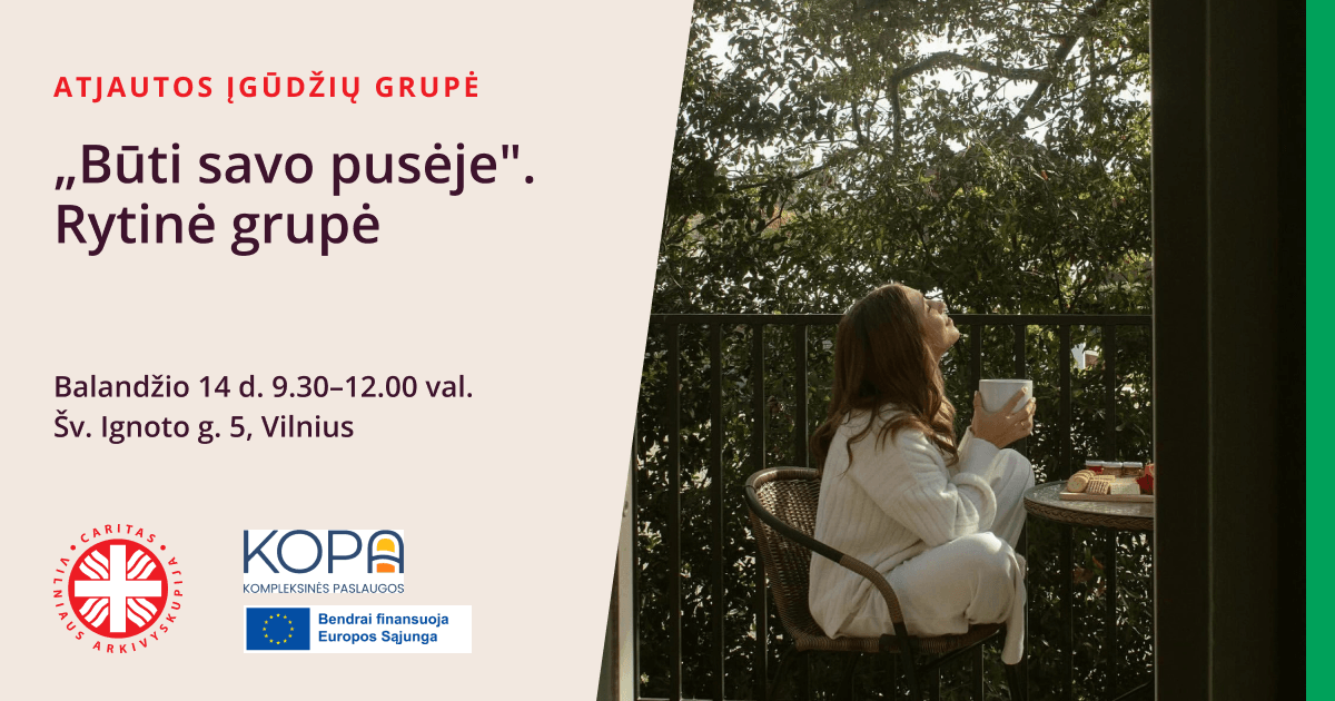 Grupės užsiėmimai nemokami, įgyvendinami pagal projektą „Kompleksinės paslaugos (KOPA)“ ir finansuojami 2021–2027 metų Europos Sąjungos fondų investicijų programos lėšomis.