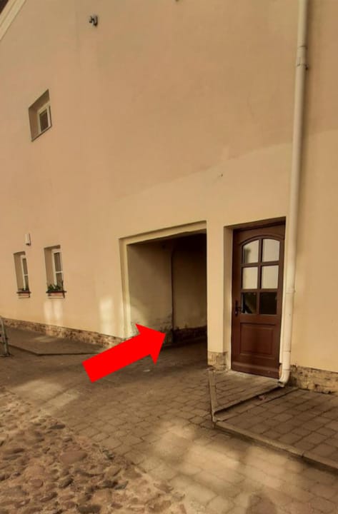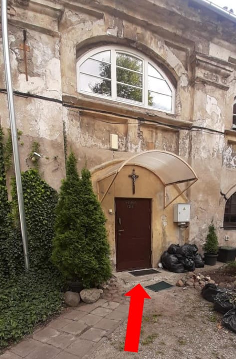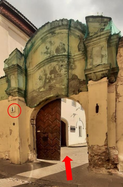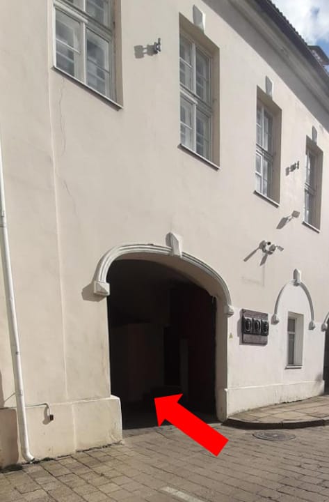 Praėjus pro arką laikytis kairės. Užeiti pro rudas duris.