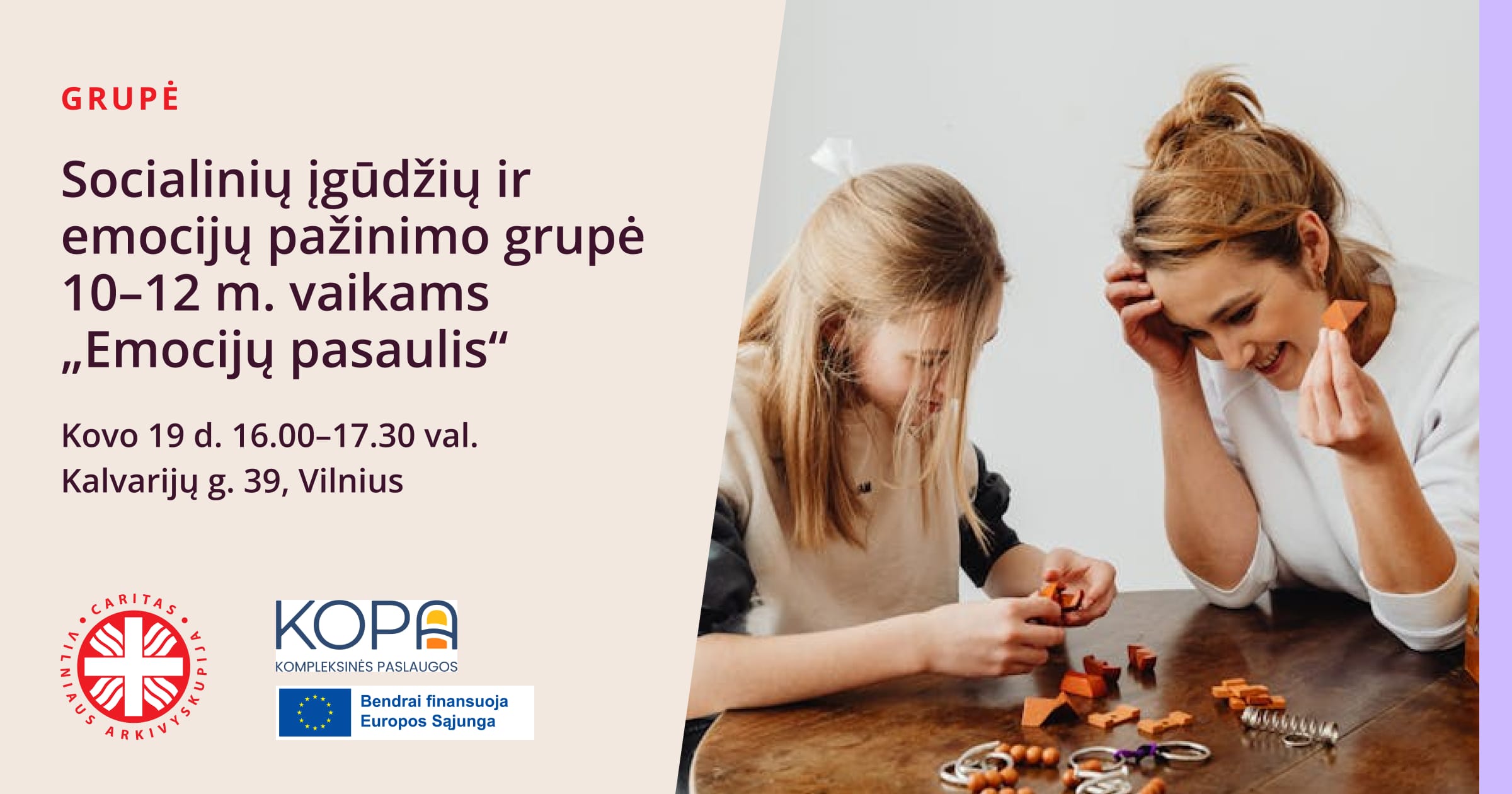 Grupės užsiėmimai nemokami, įgyvendinami pagal projektą „Kompleksinės paslaugos (KOPA)“ ir finansuojami 2021–2027 metų Europos Sąjungos fondų investicijų programos lėšomis.